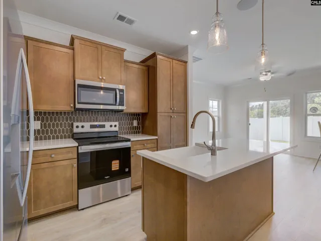 +"PublicRemarks": "The Southern Breeze II in Walker’s Trail: End Unit TownhomeThis beautifully finished end-unit townhome offers a rare blend of comfort, design, and day-to-day simplicity in one of Lexington’s most accessible and peaceful communities. Set within Walker’s Trail, the home is part of a neighborhood designed to balance quiet surroundings with quick access to shopping, dining, and major routes.Inside, warm oak hardwood stairs lead to an open main level with luxury vinyl plank flooring and upgraded carpeting that flows throughout the living spaces. The kitchen is a showpiece—featuring granite countertops, a white farmhouse sink, herringbone tile backsplash, modern cabinetry, and stainless steel appliances. It’s a space that works as beautifully as it looks.The Executive Trim Package adds crown molding in the entry, kitchen, and great room, while the owner’s suite includes granite counters, comfort-height toilets, and a brushed nickel hinged shower door for a polished, comfortable finish.Additional highlights include smart home automation, a built-in music port with ceiling speakers, full window treatments, upgraded lighting, a smart electronic deadbolt, and a covered rear porch for seamless indoor-outdoor living. Photos shown are of the model home, which is currently staged as a design center and office space. Images may not reflect standard residential layout or furnishings. Actual features and layout may vary and are subject to change without notice. ***MOVE IN PACKAGE OFFERED: Blinds, Basic Refrigerator, Washer and dryer****HOA Includes front and backyard maintenance, termite bond, power washing, roof reserves, entrance and common area maintenance Disclaimer: CMLS has not reviewed and, therefore, does not endorse vendors who may appear in listings."