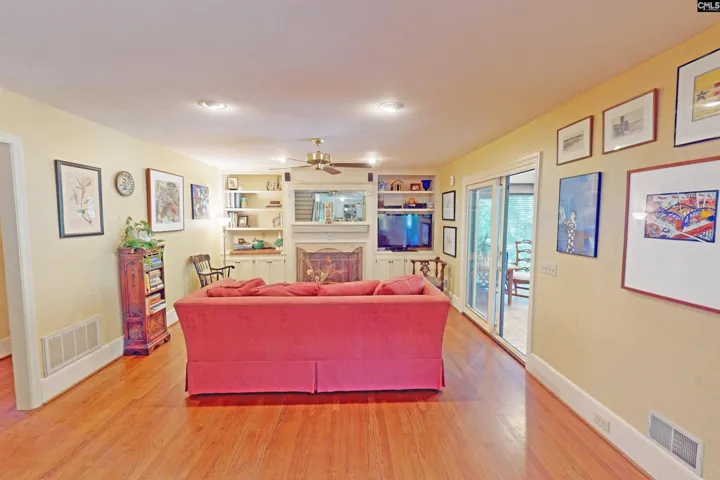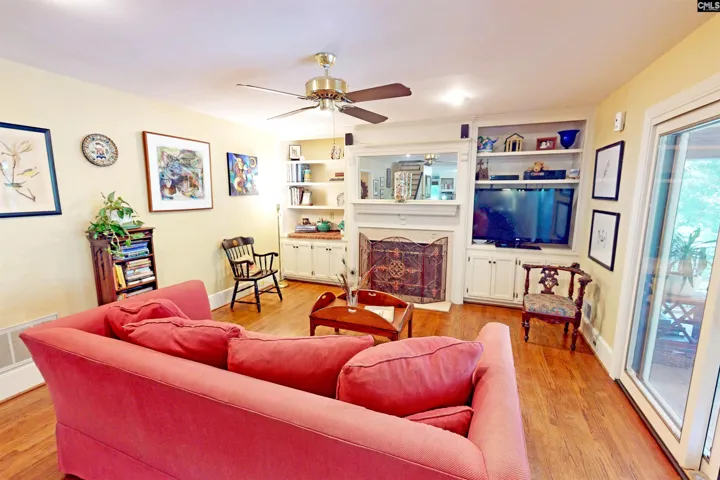 +"GreatRoom": "Bookcase,Fireplace,Floors-Hardwood,Ceiling Fan,Recessed Lights"