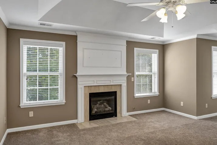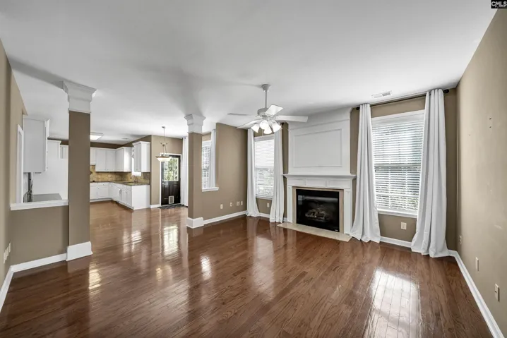 +"Living Room": "Fireplace,Floors-Hardwood,Molding,Ceiling Fan"