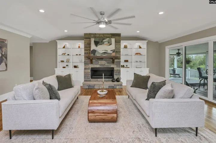 +"GreatRoom": "Bookcase,Ceilings-Cathedral,Entertainment Center,Fireplace,Floors-Hardwood,Ceilings-High (over 9 Ft),Ceiling Fan,Recessed Lights"