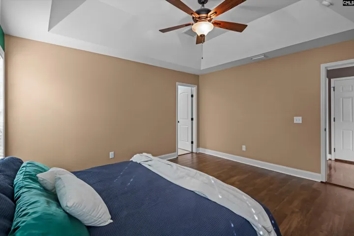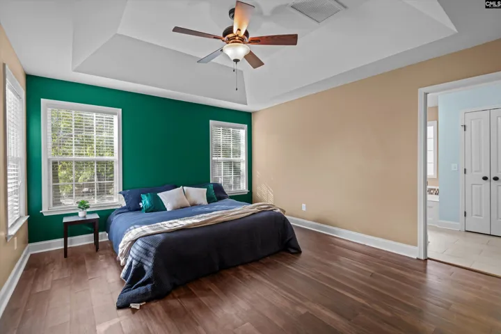+"MasterBedroom": "Double Vanity,Tub-Garden,Separate Shower,Closet-Walk in,Ceilings-Tray,Bath-Jack & Jill\u{A0}\u{A0},Ceiling Fan,Floors-Hardwood,Floors - Tile"