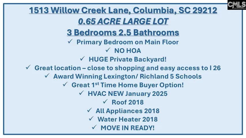 Looking for a HUGE Backyard to play and roam, but still want the feel of a neighborhood with NO HOA and the kids playing in the streets with access to great schools? This 3-bedroom and 2.5 bath home is MOVE IN READY! The ensuite primary bedroom is on the main floor and has great closet space with a separate soaking tub and shower with a dual vanity! The great room features a wood burning firplace and is open to the dining area. The great kitchen has 2018 Appliances and a view of the back deck, where you can grill our and enjoy the massive shaded backyard! With 2 additional bedrooms upstairs and a shared bathroom, this is laid out to be a great 1st time home buyer option! Do not miss this one and book your showing today! Close to Shopping, and easy access to I26 and Lake Murray too! HVAC Jan 2025, Water heater 2018, roof 2018! See the video walkthrough to appreciate all the details! Disclaimer: CMLS has not reviewed and, therefore, does not endorse vendors who may appear in listings.