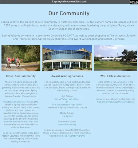 Tucked in the old charming Spring Valley gated community is this almost 1 acre cul de sac lot waiting on you to build that Southern dream home in the heart of town. This community is one of a kind with its natural beauty of mature trees, lakes, landscaping and conservation easement to stay that way. Perfect for walking, biking, running and enjoying all the optional Spring Valley Country Club that offers. Golfing, Swimming, Tennis, Clubhouse with staff and more! Your going to fall in love with this place and the lot is priced to make it happen. Disclaimer: CMLS has not reviewed and, therefore, does not endorse vendors who may appear in listings.