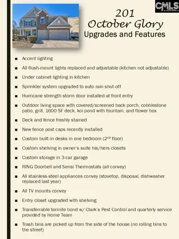 Fabulous Cobblestone Park Beauty Backing to Woods & Pond! Welcome to this stunning Grayson Floor Plan perfectly situated on a premium lot backing to serene woods and a pond w/ fountain for added privacy and picturesque views. This meticulously maintained and thoughtfully upgraded home truly has it all. The spacious kitchen is a chef’s dream, featuring granite countertops, stainless steel appliances (refrigerator conveys), double wall ovens, gas cooktop, island, pantry, and under-cabinet lighting. The bright eat-in area flows seamlessly into the large great room complete with built-ins, fireplace, and beautiful backyard views—perfect for everyday living and entertaining. Step outside to your incredible outdoor retreat featuring a covered and screened porch, expansive 1,600 SF deck, cobblestone patio, built-in grill, and tranquil koi pond with fountain—an entertainer’s paradise! This home offers: 3-car garage with custom storage, upgraded sprinkler system with auto rain shut-off, new accent lighting throughout, adjustable flush-mount lighting (except kitchen), custom shelving in owner’s suite closets, hurricane-strength front entry door, all TV mounts, built-in desks (upstairs bedroom), RING doorbell, and Sensi thermostats convey. Cobblestone Park is a gated community offering: Resort-style pool, Playground, Fitness center, Basketball & volleyball and Tennis courts, 27-hole championship golf course, Clubhouse & on-site restaurant, Convenient side-yard trash pickup (no curb duty!) Added peace of mind with a current transferable Clark’s termite bond and the Home Team in-wall quarterly pest system—no interior spraying required. This exceptional home blends luxury, comfort, and resort-style living in one of the area’s most sought-after communities. Enjoy the benefits of a revitalized HOA and an active community lifestyle! Residents can take part in a variety of social and fitness activities, including book club, Zumba, strength training, pickleball, tennis, women’s fellowship gatherings, festive holiday events, and so much more. There’s truly something for everyone to connect, stay active, and feel right at home! Disclaimer: CMLS has not reviewed and, therefore, does